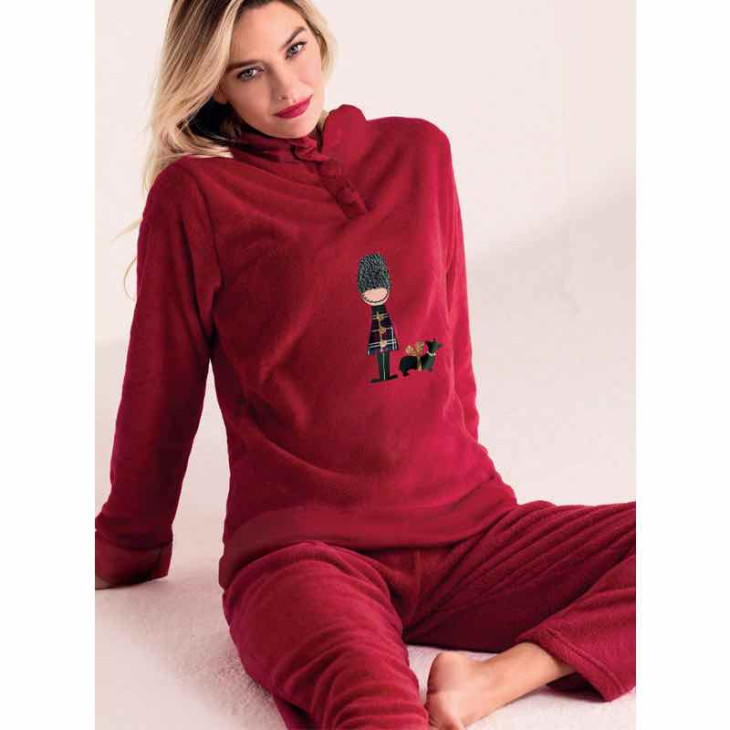 Pyžamo Infiore 652856 z hebkého a hrejivého materiálu je ideálnou voľbou na chladné dni. Vrchný diel má dlhé rukávy, stojačik so zapínaním na gombíky a ozdobný motív, ktorý dodáva pyžamu hravý a zimný nádych. Nohavice sú dlhé, mäkké a príjemne elastické, takže sa pekne prispôsobia postave. Balené v darčekovej krabici.